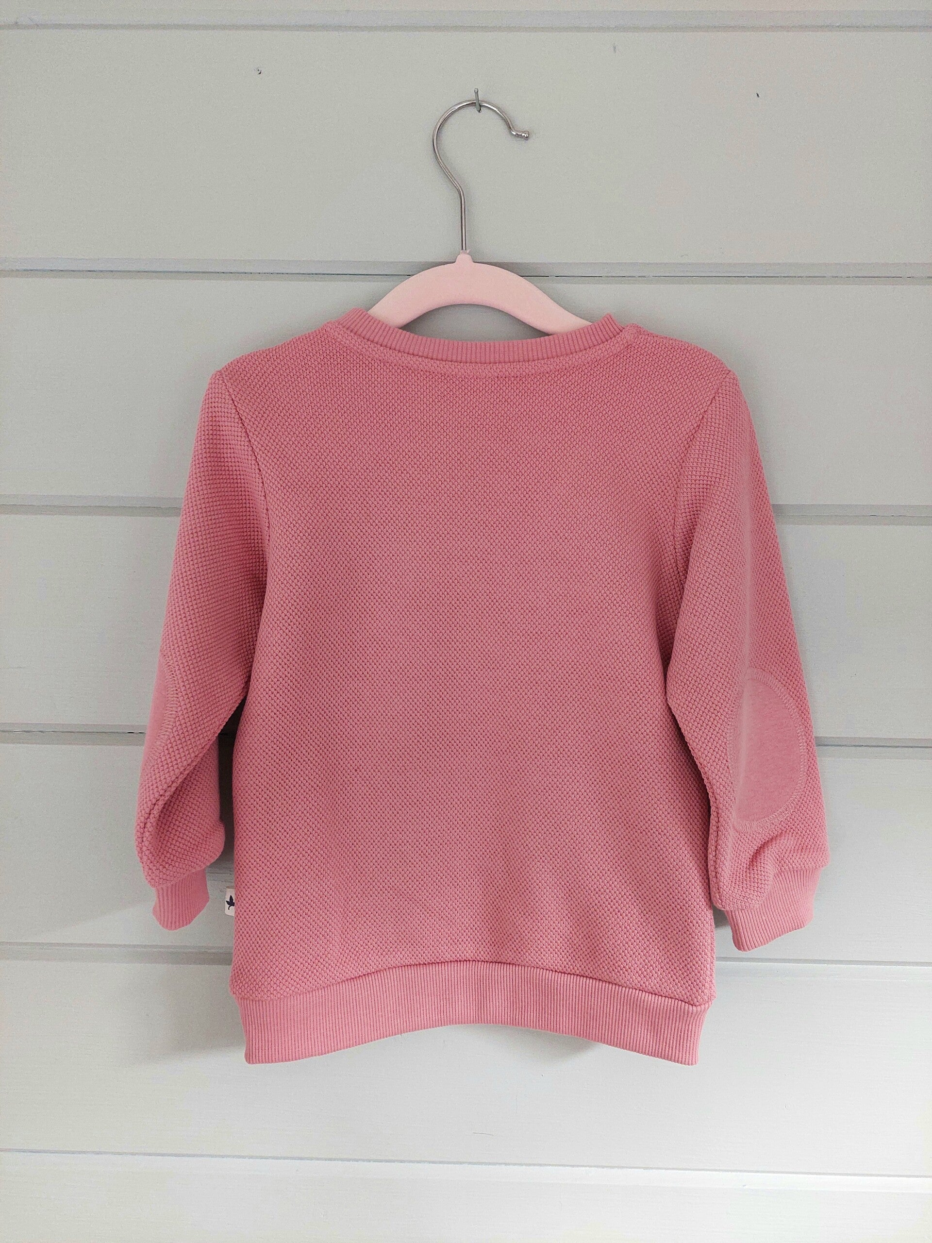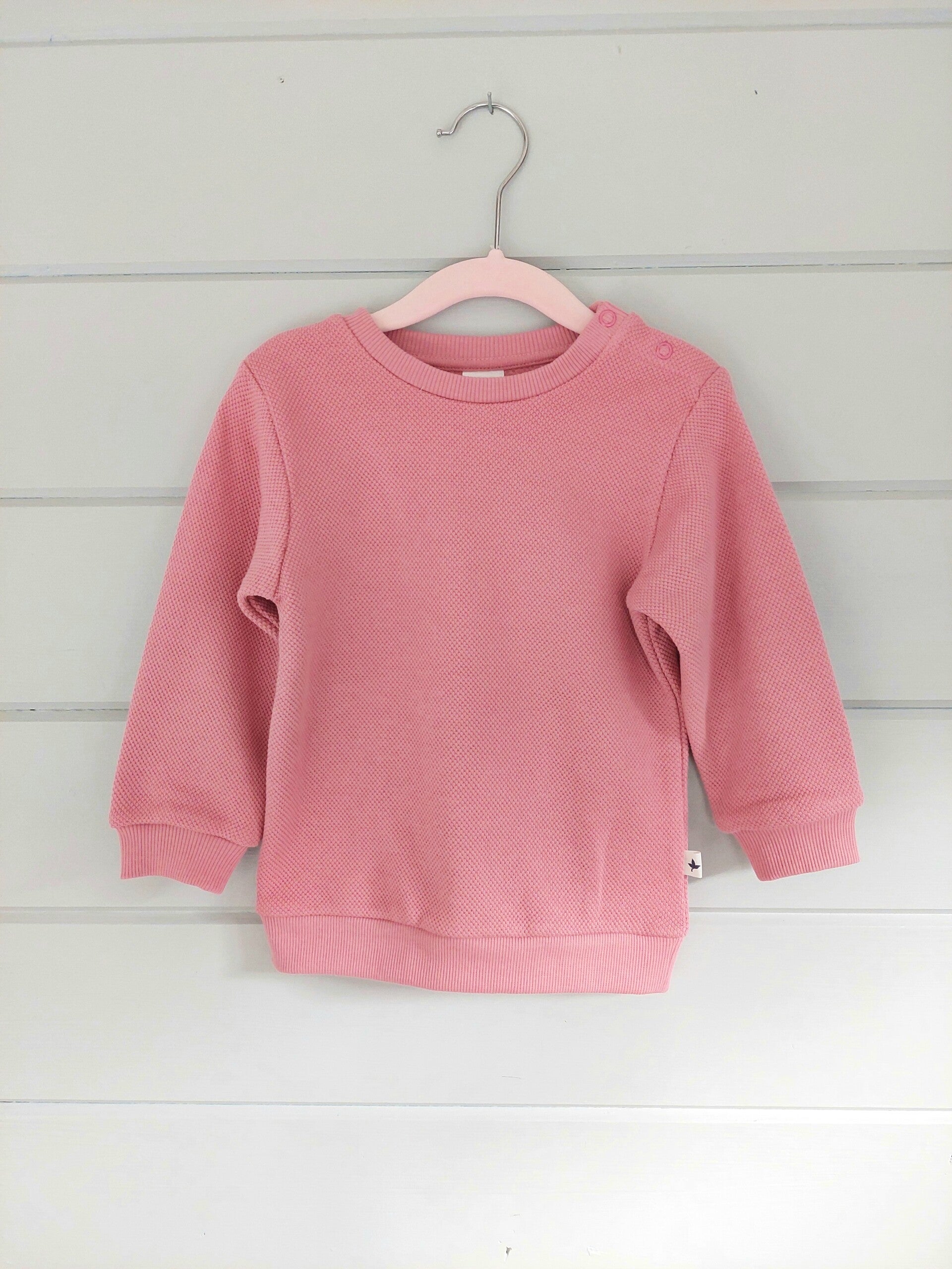 Er zitten drukknopen aan de trui tot maat 98/104.